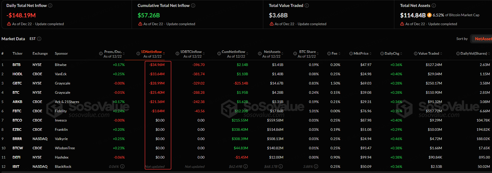 The Bitcoin spot ETF with the highest net outflow on Dec. 22 was Bitwise Bitcoin ETF , with a net outflow of $34.96 million.