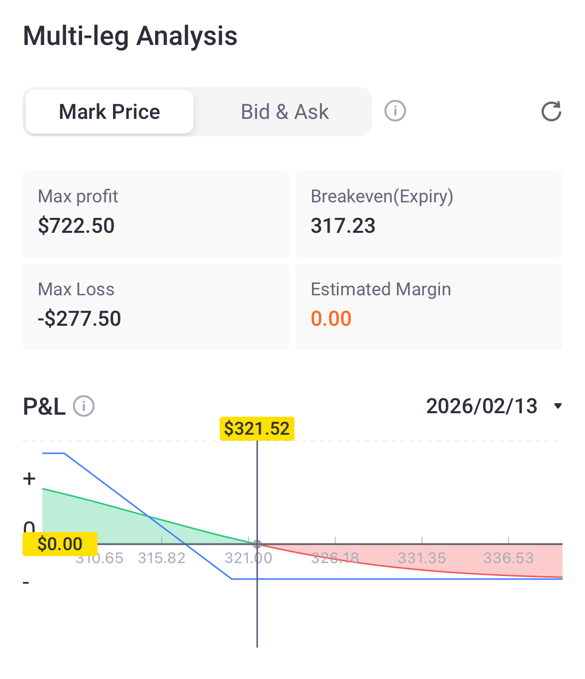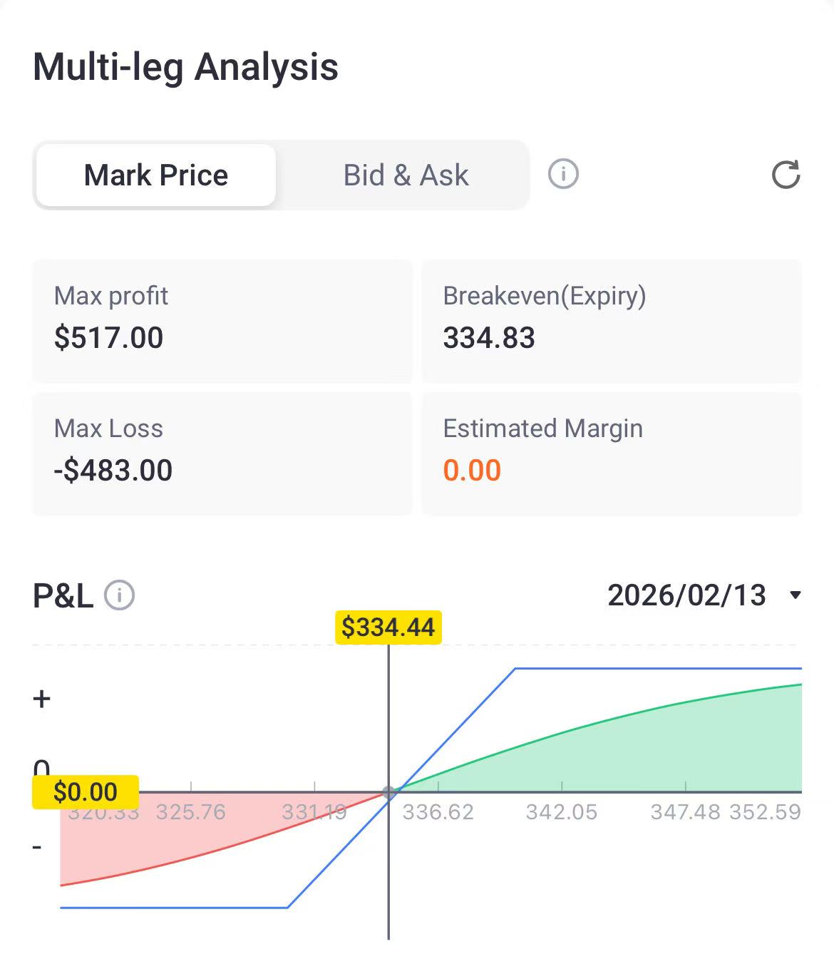 Rationale: For investors constructive on the medium- to long-term outlook but seeking to reduce upfront premium costs, this strategy offsets part of the call purchase by selling a higher-strike call, capping both upside and downside within the $330–$340 range.