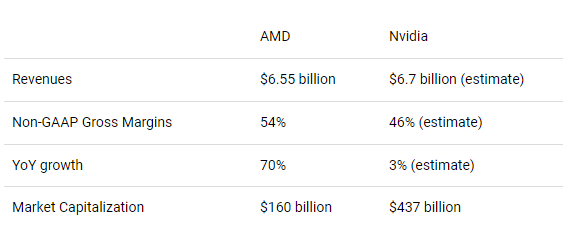 Nvidia is a great company, but the stock is wildly overpriced, especially given the deteriorating fundamentals. AMD is a great company with increasingly strong fundamentals and a lot of room to continue to take market share from Intel and Nvidia with very competitive products (and strong products in the pipeline). Why anyone would pay almost 3 times as much for Nvidia is beyond me.