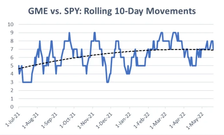 The chart shows the rolling ten-year relationship between GameStop stock and the S&P 500 (SPY). It simply counts the number of days in the previous 10 in which both GME and SPY moved in the same direction — that is: either up together or down together.