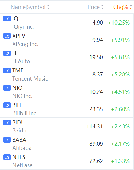 iQiyi rose 10%; XPeng, Li Auto rose nearly 6%; Alibaba, Baidu rose over 2%.