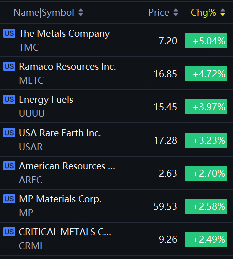 Rare earth stocks jumped. The Metals, Ramaco Resources up around 5%; Energy Fuels up 4%; USA Rare Earth, American Resources up about 3%.