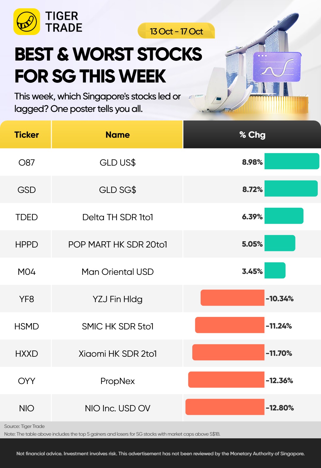 In terms of individual stocks, $GLD US$(O87.SI)$ and $GLD SG$(GSD.SI)$ rose 9%; Delta TH SDR 1to1 rose 6%; while NIO Inc. USD OV and PropNex fell 12%; Xiaomi HK SDR 2to1 and SMIC HK SDR 5to1 fell 11%; YZJ Fin Hldg fell 10%.
