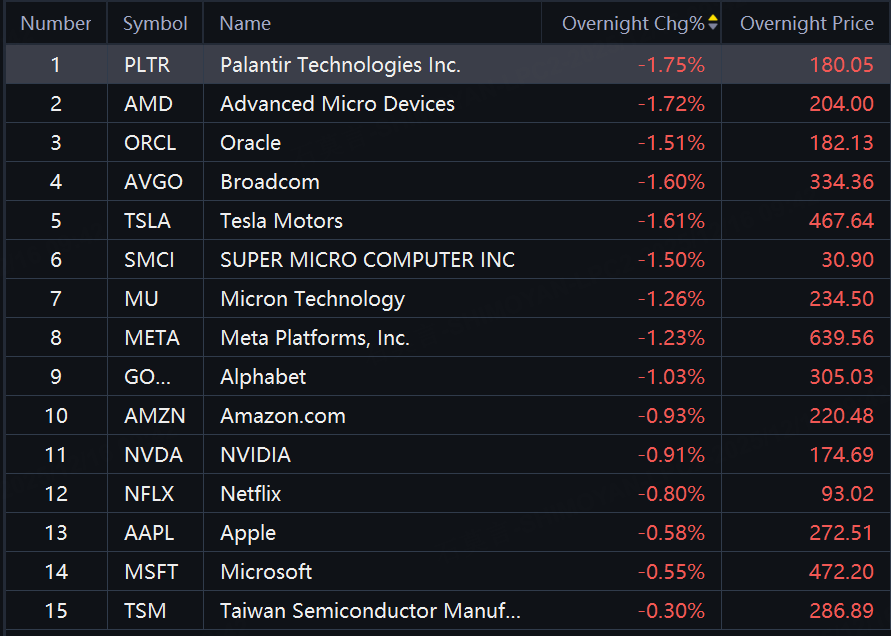 Big tech stocks dropped in overnight trading with Palantir, Broadcom, Tesla, Oracle dropping over 1%.