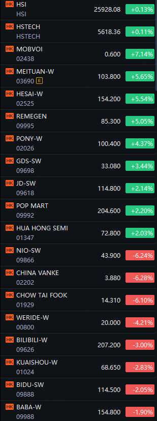 Mobvoi up 7%; Meituan, Hesai and Remegen up 5%; Nio, China Vanke and Chow Tai Fook down 6%.