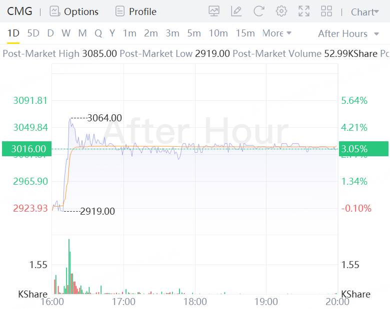 Shares of the company were up 3% at $3,016 in extended trading. They breached the $3,000 mark for the first time after the company approved a 50-for-1 stock split last month.