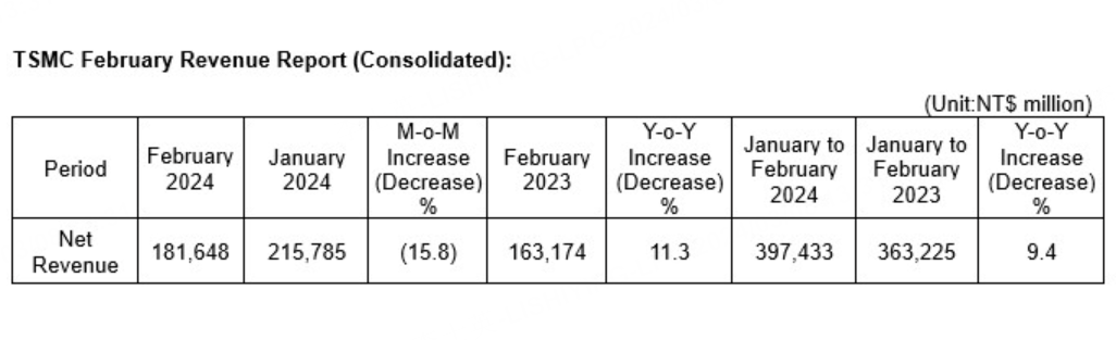 TSMC today announced its net revenue for February 2024: On a consolidated basis, revenue for February 2024 was approximately NT$181.65 billion, a decrease of 15.8 percent from January 2024 and an increase of 11.3 percent from February 2023. Revenue for January through February 2024 totaled NT$397.43 billion, an increase of 9.4 percent compared to the same period in 2023.