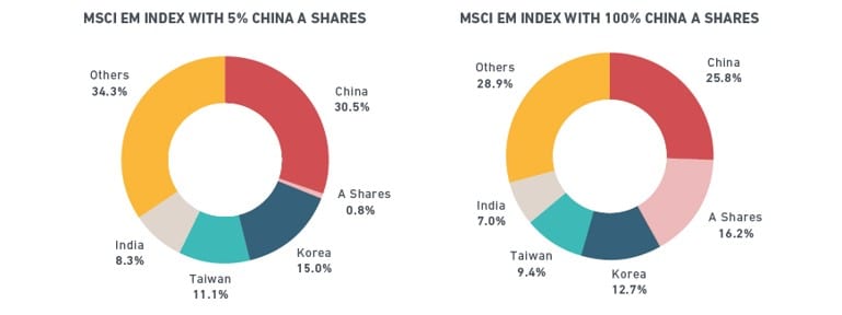 2. Inclusion of China A-shares in the MSCI Emerging Index.MSCI began including China large-cap A-shares in the MSCI Emerging Index on 31 May 2018. Based on data from MSCI in 2018, China equities form 31.3% of the MSCI Emerging Markets Index at 5% inclusion.