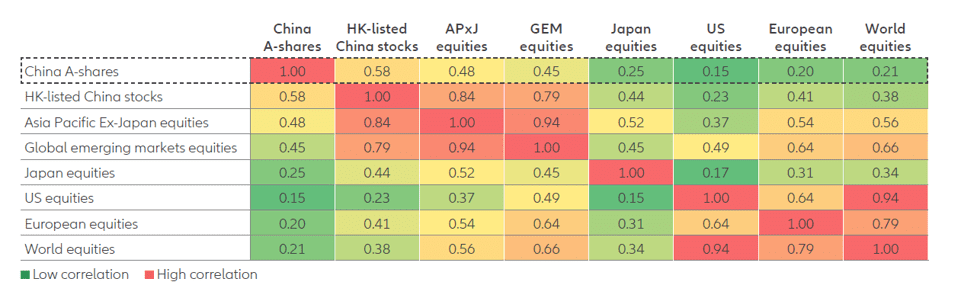 Holding China equities can offer diversification benefits during market downturns such as the period of the COVID-19 pandemic when highly correlated asset classes fell.