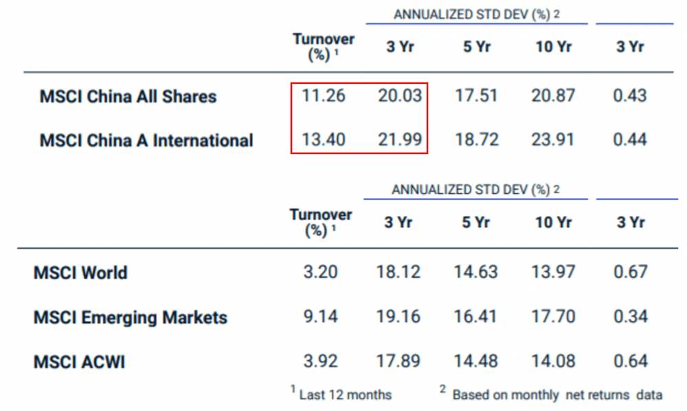 MSCI Index Comparison of Turnover and Standard Deviation as of 31 March 2021. Source: MSCI China All Shares Index, MSCI World Index