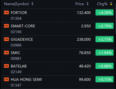 Hong Kong’s semiconductor stocks rose on Friday. Fortior up 5%; Smart-Core up 3%; GigaDevice, SMIC up 2%; Batelab up 1%.
