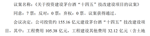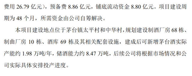 贵州茅台此前发布公告,公司计划投资约155.16亿元建设茅台酒“十四五”技改建设项目,其中:工程费用105.38亿元,工程建设其他费用32.12亿元(含土地费用26.79亿元),预备费8.86亿元,铺底流动资金8.80亿元。规划建设制酒厂房68栋、制曲厂房10栋、酒库69栋及其相关配套设施,建成后可新增茅台酒实际产能约1.98万吨/年,储酒能力约8.47万吨。