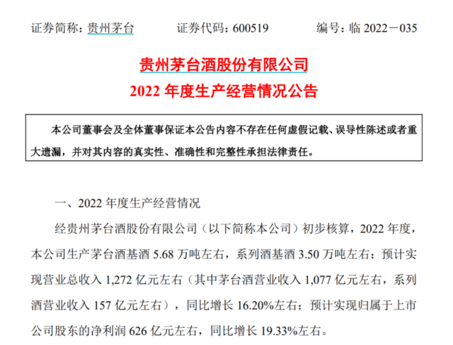 12月29日晚间,贵州茅台发布2022年度生产经营情况。公司预计全年实现营业总收入1272亿元,同比增长16.20%;预计实现归属于上市公司股东的净利润626亿元,同比增长19.33%左右。