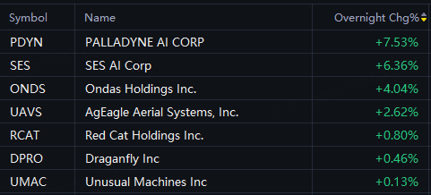 Drone-related stocks rallied in overnight trading. Palladyne AI up 8%; SES AI up 6%; Ondas up 4%; AgEagle Aerial Systems up 3%; Red Cat up 1%.