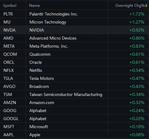 Big tech stocks rose in overnight trading. Palantir up 2%; Nvidia, Meta, AMD, Micron up 1%.