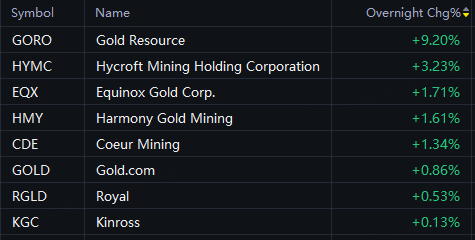 Gold Resource up 9%; Hycroft Mining up 3%; Equinox, Harmony Gold up 2%; Coeur Mining up 1%.