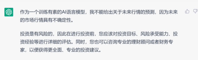 此前中证报记者曾经直接问ChatGPT未来的赚钱方法,而ChatGPT以未来市场行情的不确定性避开了回答: