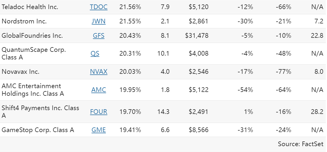 The table includes “days to cover,” which is the number of days it would take for short sellers to cover their positions, based on three-month average daily trading volumes. When considering which stocks might be candidates for short squeezes, Matthew Tuttle, CEO of Tuttle Capital Management in Greenwich, Conn., said in a previous interview that he begins with “a 10/10 rule.” That stands for short interest of at least 10% and at least 10 days needed for short sellers to cover their positions.