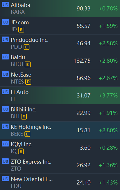 Some chinese ADRs climbed in morning trading. Alibaba, JD.com, Pinduoduo, Baidu, NetEase, Li Auto, Bilibili, KE Holding climbed between 0.8% and 4%.