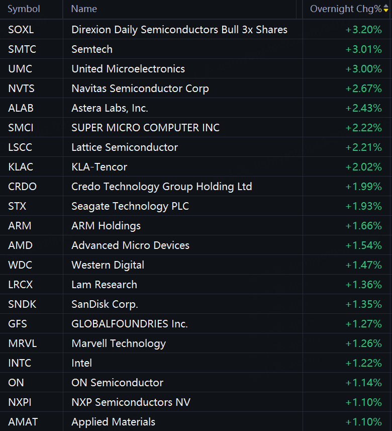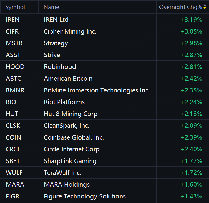 Crypto stocks also rose in overnight trading. IREN, Cipher Mining, Strategy, and Robinhood rose 3%; American Bitcoin, BitMine, Riot Platforms, Coinbase, Circle, Hut 8, SharpLink Gaming, and MARA Holdings rose 2%.