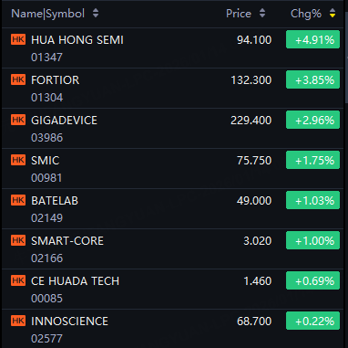 Hong Kong’s semiconductor stocks rose on Wednesday. Hua Hong Semi up 5%; Fortior up 4%; GigaDevice up 3%; SMIC up 2%; CE Huada Tech up 1%.