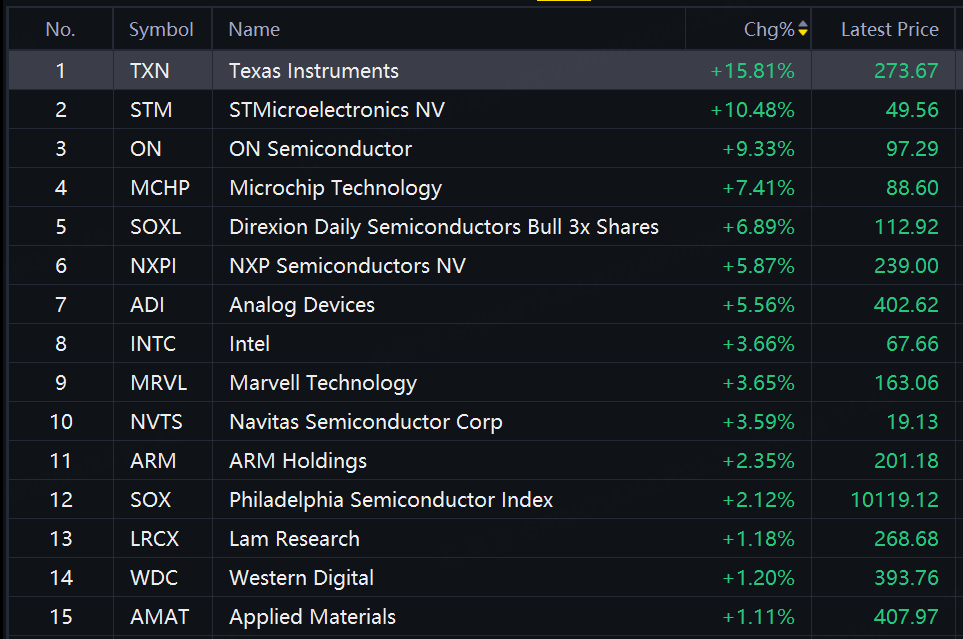 Texas Instruments up 16% to record high; Analog Devices up over 5%; Marvell, Intel, Navitas up over 3%.