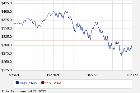 Turning to the calls side of the option chain, the call contract at the $315.00 strike price has a current bid of $6.25. If an investor was to purchase shares of QQQ stock at the current price level of $305.82/share, and then sell-to-open that call contract as a "covered call," they are committing to sell the stock at $315.00. Considering the call seller will also collect the premium, that would drive a total return (excluding dividends, if any) of 5.05% if the stock gets called away at the August 29th expiration (before broker commissions). Of course, a lot of upside could potentially be left on the table if QQQ shares really soar, which is why looking at the trailing twelve month trading history for Invesco QQQ Trust, as well as studying the business fundamentals becomes important. Below is a chart showing QQQ's trailing twelve month trading history, with the $315.00 strike highlighted in red: