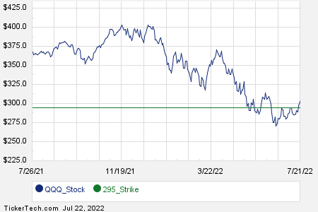 Below is a chart showing the trailing twelve month trading history for Invesco QQQ Trust, and highlighting in green where the $295.00 strike is located relative to that history: