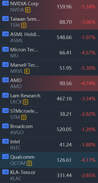 Semiconductor stocks slid in morning trading. Nvidia, TSMC, ASML, Micron, AMD, Marvell Technology, Intel and Qualcomm fell between 1% and 6%.