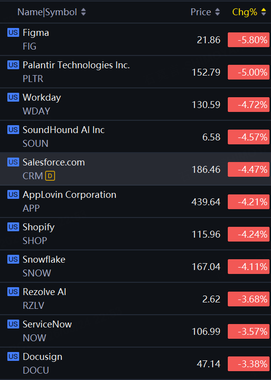 Figma down about 6%; Palantir down 5%; Workday, SoundHound AI, Salesforce, AppLovin, Snowflake down over 4%.