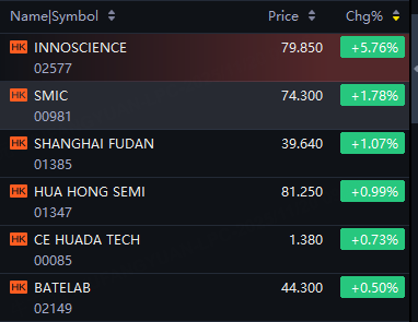 Hong Kong’s semiconductor stocks rose on Thursday. Innoscience rose 6%; SMIC rose 2%; Shanghai Fudan, Hua Hong Semi up 1%.