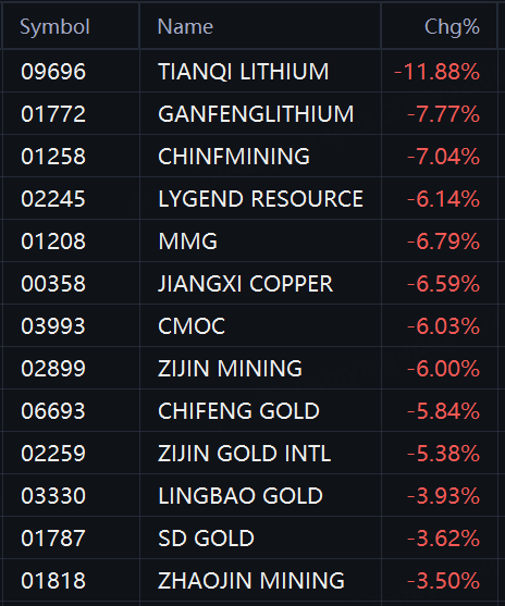 Nonferrous metal stocks sank in Hong Kong. Tianqi Lithium fell 12%; Ganfeng Lithium fell 8%; China Nonferrous Mining, MMG, and Jiangxi Copper fell 7%; Lygend Resources, CMOC, Zijin Mining,and Chifeng Gold fel 6%; Zijin Gold International fell 5%; Lingbao Gold, SD Gold, and Zhaojin Mining fell 4%.