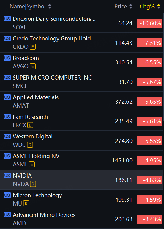 Chip stocks fell on Thursday. SOXL down over 10%; Credo down over 7%; Broadcom, SMCI, Lam Research, Western Digital, ASML down over 5%.