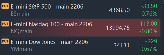 At 8:00 a.m. ET, Dow e-minis were down 229 points, or 0.67%, S&P 500 e-minis were down 33.5 points, or 0.76%, and Nasdaq 100 e-minis were down 113 points, or 0.8%.
