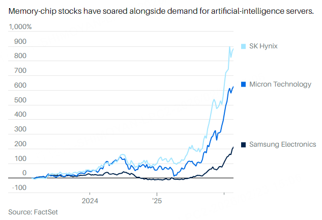 The latest winners in the artificial-intelligence trade are memory-chip makers. Micron Technology, SK Hynix, and Samsung Electronics are soaring as AI growth creates huge demand for their hardware. But the history of the industry shows investors need to watch for a downturn, as the race to increase production creates the risk of an eventual glut of hardware and a painful crash.