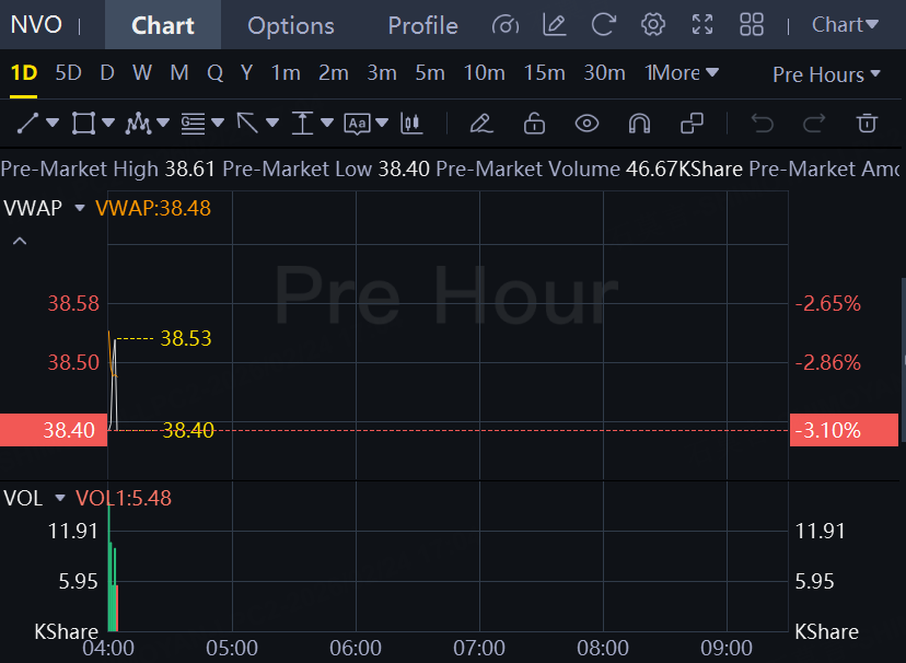 Novo Nordisk shares fell another 3% in premarket trading after closing 16% lower on Monday. Novo Nordisk's miss of a key goal in a late-stage comparison clinical trial of obesity drug CagriSema with Eli Lilly's Zepbound is a blow to the Danish drugmaker's long-term outlook, Citi analysts say.