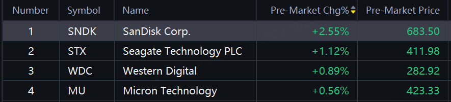 Storage shares rose in premarket trading. SanDisk up 2.55%; Seagate Tech, Western Digital up around 1%.