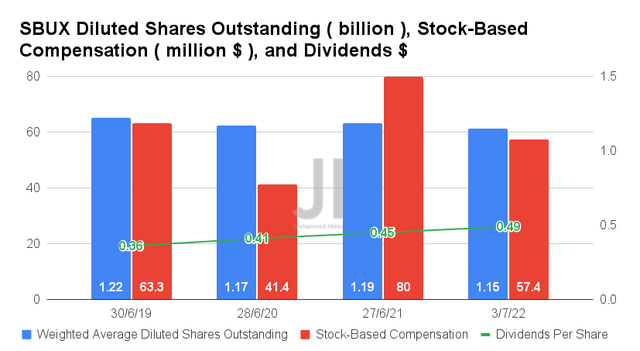 For now, SBUX investors seem upbeat as well, due to the company's planned $20B of capital return over the next three years, in the form of dividend hikes and share buybacks. The management has guided an average of 2% dividend yield at the same time, representing notable improvements from the previous 4Y average of 1.88%. Combined with the consistent dividend hikes of 36.11% and $6.03B in share buybacks contributing to the moderation in its share count by -5.73% since FY2019, it is no wonder that the stock has performed decently, with a 5Y Total Price Return of 78% and 10Y Return of 313.1%.