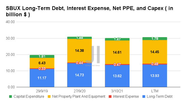 In its recent Investor Day presentation, SBUX guided massive expansion plans ahead, with capital expenditures of up to $3B for the next three years, including $450M for existing store upgrades. In addition, the company plans to build up to 2K new locations within the US, with a total of 9K stores in China and 2K in Japan by 2025. Therefore, we expect to see a moderate increase in its debt leveraging ahead from the $13.93B reported in the last quarter. Nonetheless, investors have nothing to worry about, since only $1.75B will be maturing by the end of 2023. Thereby, moderately ensuring SBUX's liquidity ahead.