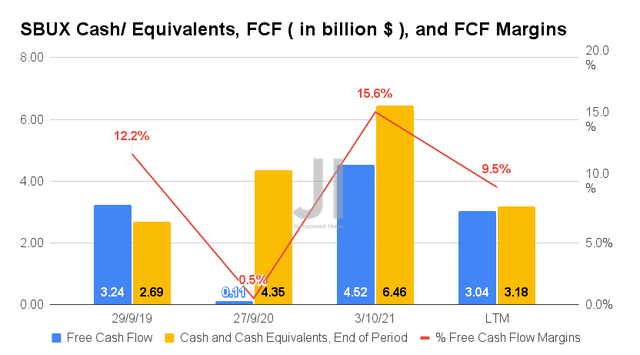 Furthermore, SBUX seemed well poised for its aggressive expansion, given the robust Free Cash Flow (FCF) generation of $3.04B and an FCF margin of 9.5% in the LTM. Though these numbers are still shy of their pre-pandemic levels by -6.17% and -2.7 percentage points, respectively, we must also highlight the company's relatively stronger cash and equivalents of $3.18B on its balance sheet in the latest quarter.