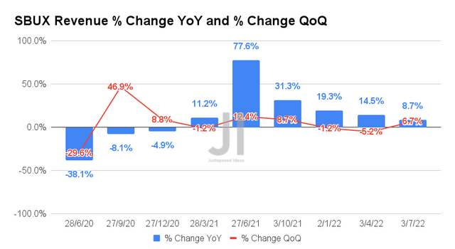 Though SBUX may have reported decentFQ3'22 earnings with robust consumer spending trends, we may see a quick turnabout soon, since food and gas prices remain inflated for now compared to pre-pandemic levels. Its revenue growth is already showing signs of deceleration QoQ and YoY, pointing to the expected normalization from the hyper-growth experienced during the reopening cadence in 2021.