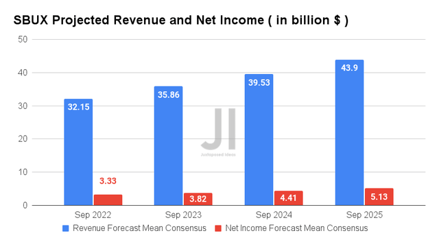 Over the next four years, SBUX is expected to report revenue and net income growth at an exemplary CAGR of 12.62% and 5.13%, in comparison to the 2Y pandemic CAGR of 5.73% and 8.03%, respectively. It is also evident that Mr. Market is relatively confident about the company's forward profitability, given the growth in its adj. net income margins from 9.4% in FY2019, to 10.1% in FY2021, and finally to 11.68% by FY2025.