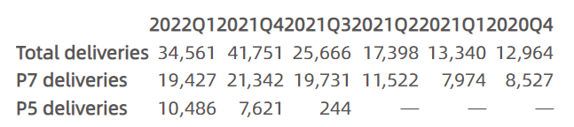 - Deliveries of the P7 smart sports sedan were 19,427 in the first quarter of 2022, representing an increase of 144% from 7,974 in the corresponding period of 2021. Monthly delivery of the P7 smart sports sedan exceeded 9,000 in March 2022 for the first time.