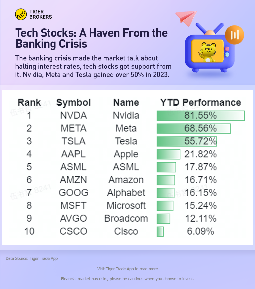 The recent banking crisis made investors and the Fed talk about halting interest rates, tech stocks may get support from it. As of Mar.27, Nasdaq Index rose 12.44% this year, while Nvidia, Meta and Tesla surged over 50% in 2023.