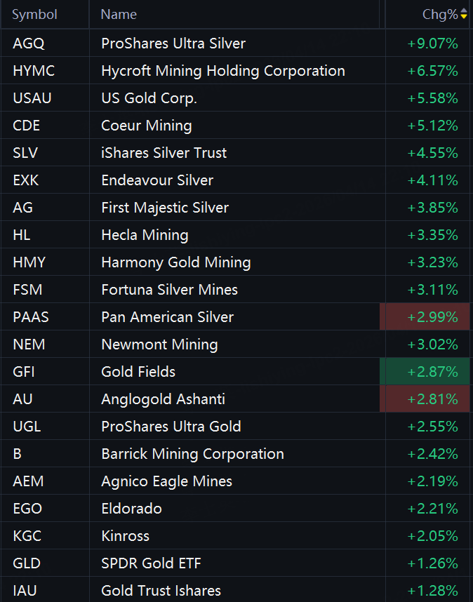 Precious metal stocks and ETFs jumped in morning trading. ProShares Ultra Silver rose 9%; Hycroft Mining rose 7%; US Gold Corp. rose 6%; Coeur Mining and iShares Silver Trust rose 5%; Endeavour Silver and First Majestic Silver rose 4%; Hecla Mining, Harmony Gold, Fortuna Silver Mines, Newmont, Pan American Silver, Gold Fields, Anglogold Ashanti, and ProShares Ultra Gold rose 3%; Barrick Mining, Agnico Eagle Mines, Eldorado, and Kinross rose 2%; SPDR Gold ETF and Gold Trust Ishares rose 1%.