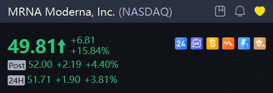 Moderna shares gained another 4% in overnight trading. Shares of Moderna popped 16% on Wednesday after the biotech leader announced positive clinical trial results for its experimental skin cancer vaccine, developed with healthcare giant Merck.