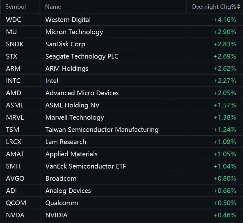 Chip stocks gained again in overnight trading. Western Digital rose 4%; Micron, SanDisk, Seagate Technology, and Arm rose 3%; Intel, AMD, and ASML rose 2%; Marvell Technology, TSMC, Lam Research, and Applied Materials rose 1%.