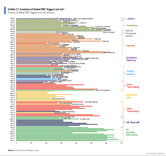 Since COVID-19 became a global pandemic a year ago, the virus has dominated the rankings as the top trail risk by fund managers. For the first time since February 2020, COVID-19 is no longer in the top spot.