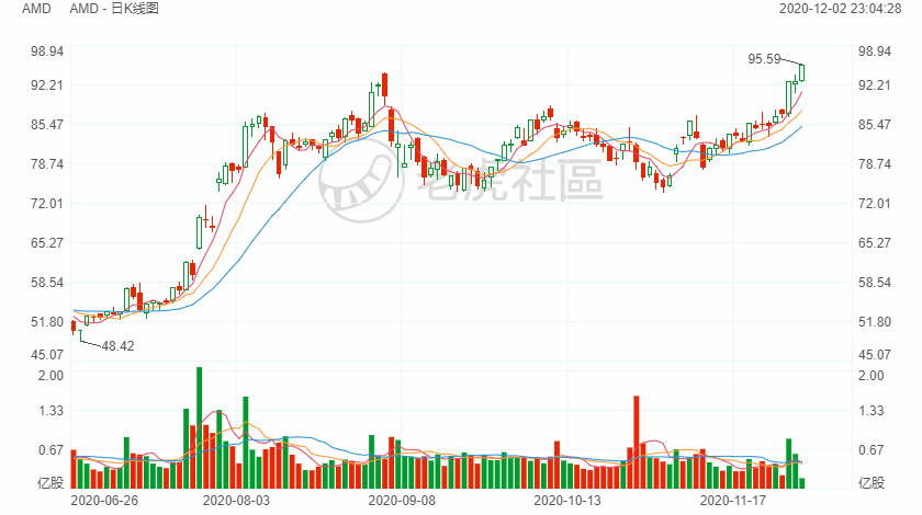12月2日美股早盘,AMD拉升涨超3%,股价高见95.59美元,创历史新高。