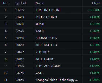 HK electrical components shares rally. Time Intercon up 15%; Prosp GP up 4%; JLMag up 3%; CNGR, ShuangDeng, Rept Battero and Zenergy up 2%.